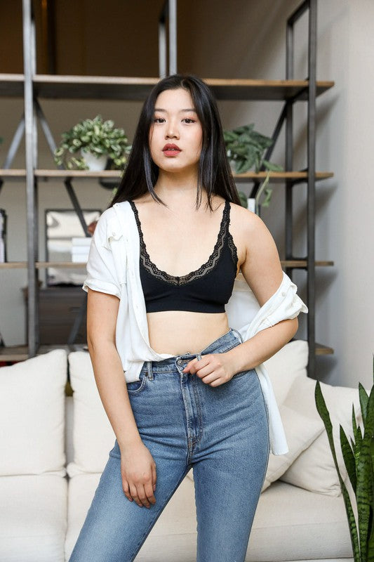 Discover the comfort and style of our Erin bralette, featuring delicate lace detailing with a scalloped edge, enhancing any outfit with feminine charm. Supportive casual bralette with versatile elegance. Whether worn alone as a statement piece or peeking out from beneath your favorite top.