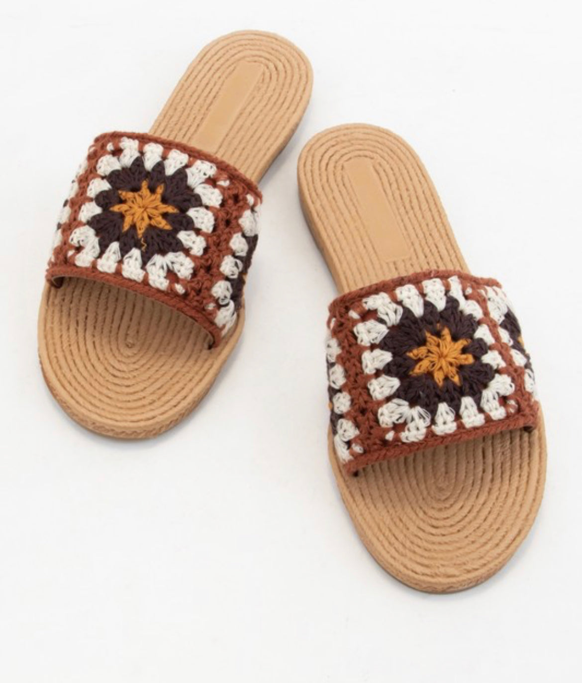 An easy and effortless essential, these slip-on sandals feature sweet crocheted straps, inspired by vintage "granny squares" for the most charming touch.