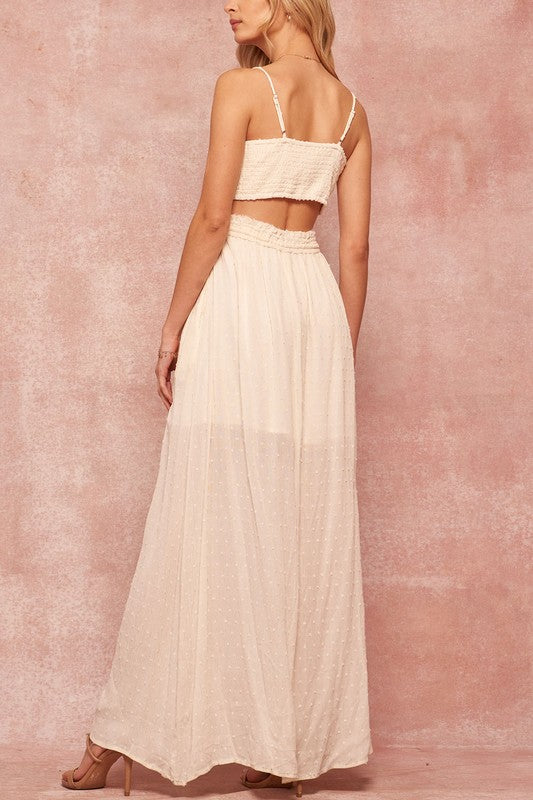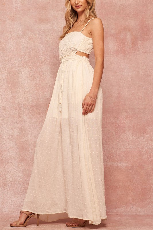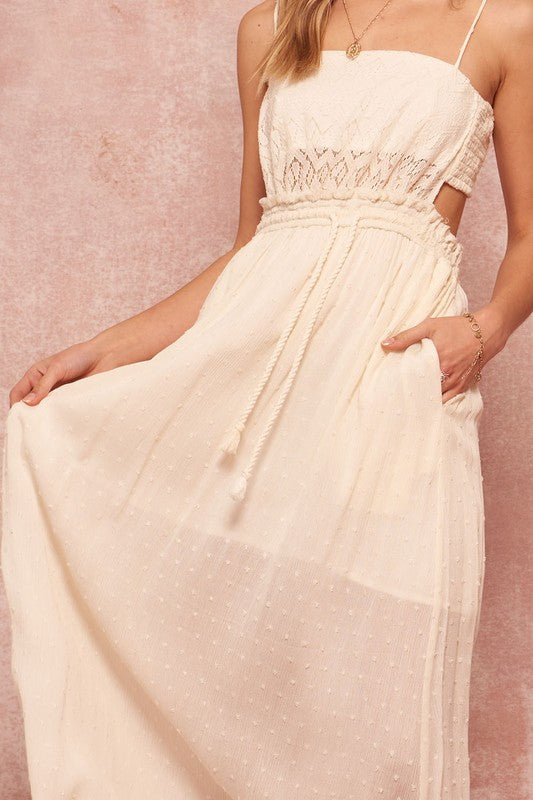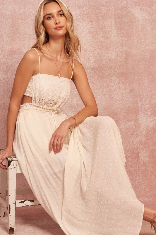 A Swiss dot and lace maxi dress with the following features: Lace bodice. Straight neckline. Sleeveless. Adjustable cami shoulder straps. Drawstring elastic waist with ruffle. Side slit. Smocked back with cutout. High-waist silhouette. Bandeau bodice lining and thigh-length skirt lining.